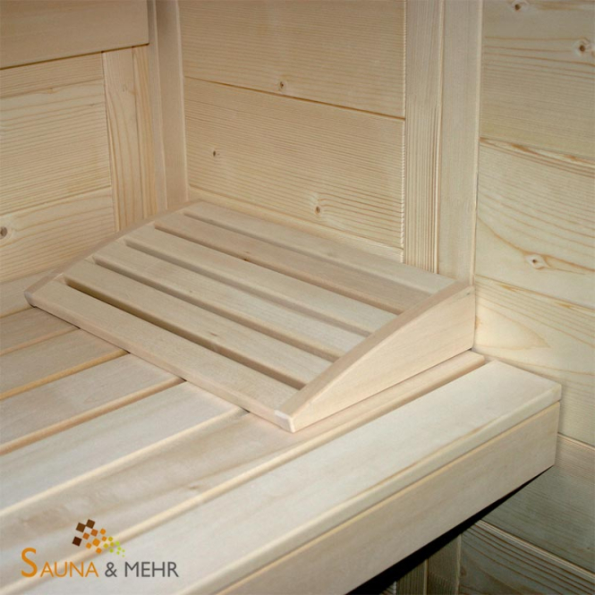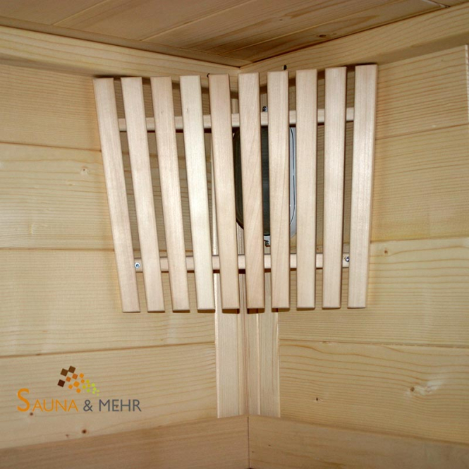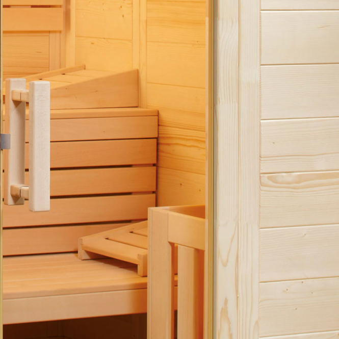 wood.LINE Trend - unsere preisgünstige Massivholz Sauna, Blockbohlen aus nord. Fichtenholz prägen neben der Glastür und der hochwertigen Komfort Inneneinrichtung mit 62 cm tiefen Bänken den überaus soliden Eindruck dieses Modells.