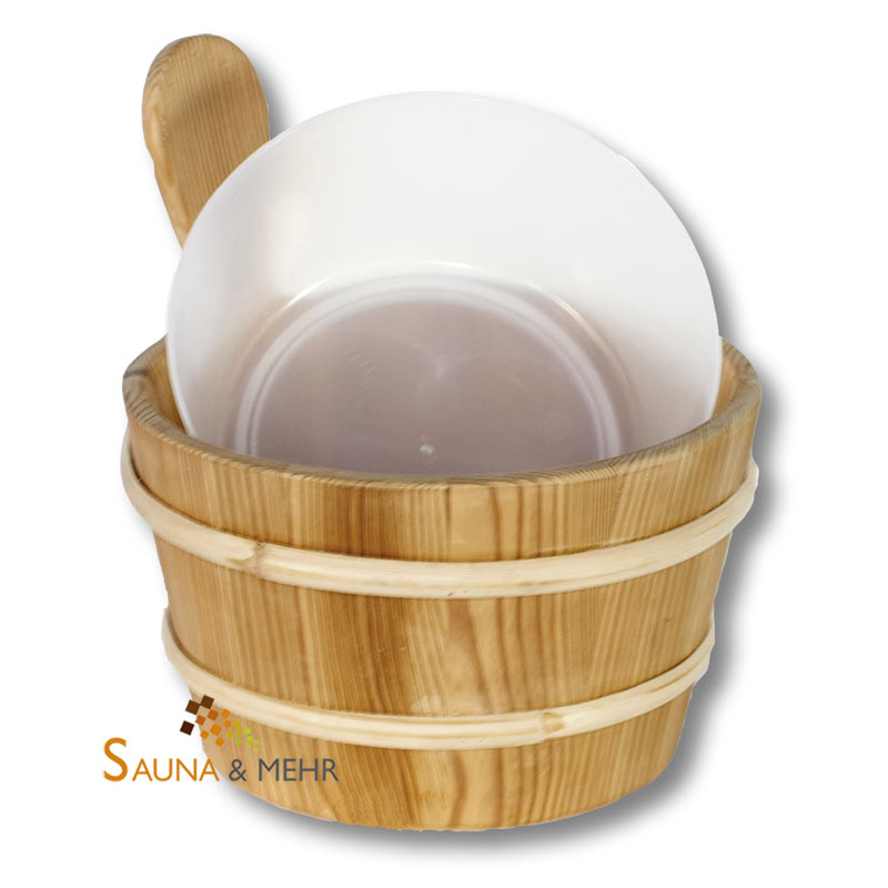 Aufguss Holzkübel aus dunklem Thermoholz in massiver Ausführung mit herausnehmbarem Kunststoffeinsatz. Hygienische, einfache Reinigung und lange Lebensdauer.